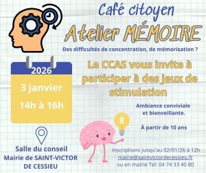 ATELIER MEMOIRE organisé par le CCAS de Saint Victor de Cessieu Samedi 3 Janvier 2026 ouvert à tous et toutes à partir de 10